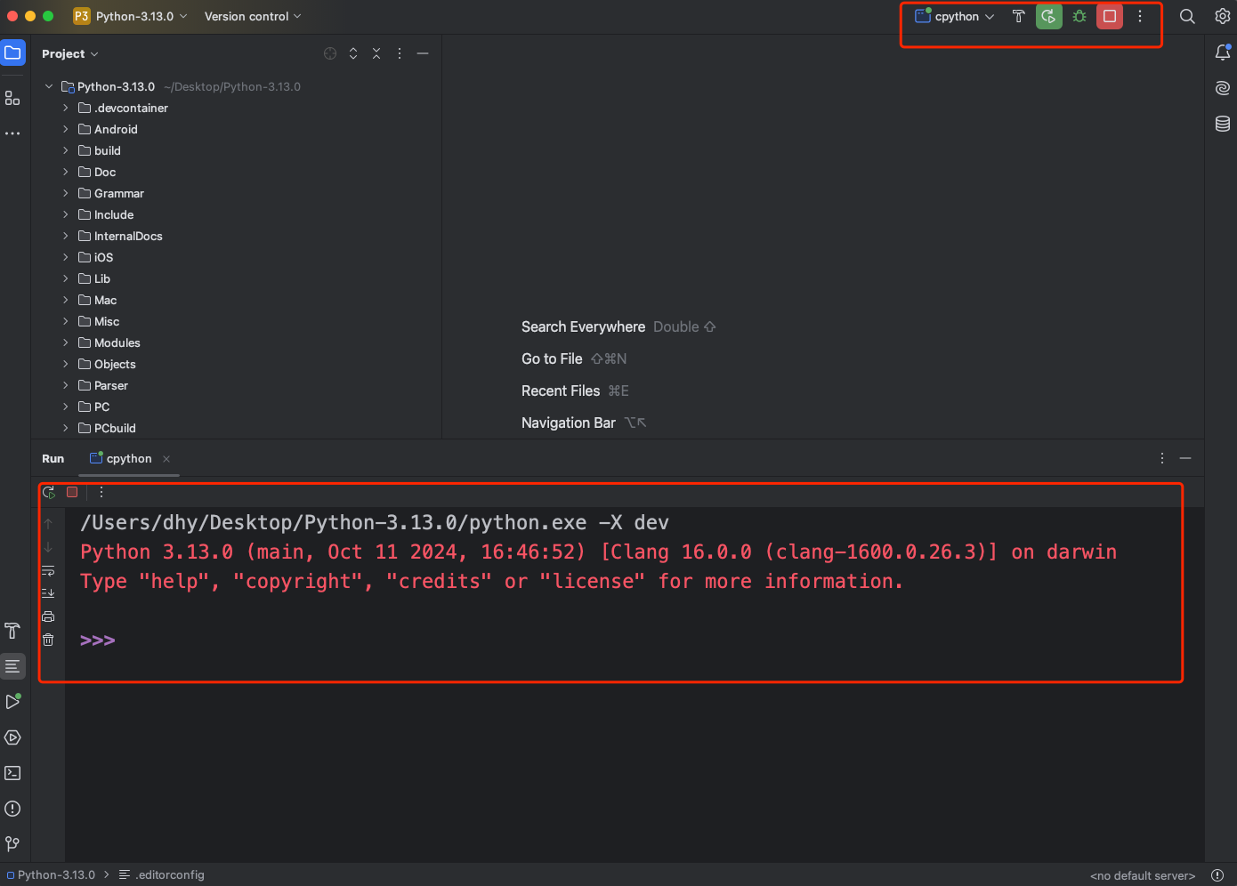 如果在CPython中设置了任何断点的话,使用DEBUG模式运行即可。